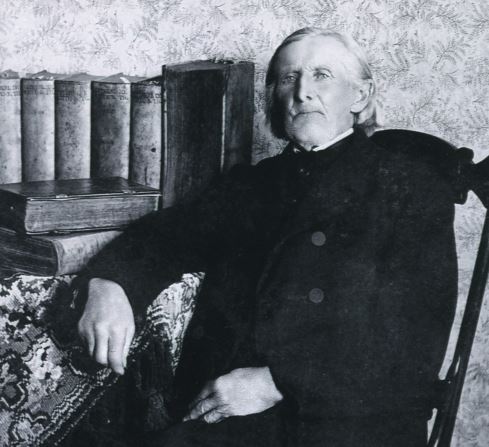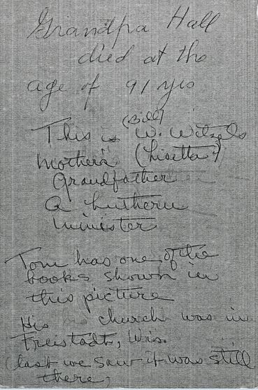 The family story says that the above pictured gentleman (who is my husband’s 3rd great grandfather) was a Lutheran Minister who changed his last name to Hall upon immigration to the United States. Hell being the German word for “light”, the name was appropriate for a minister, but upon immigration the name was changed because it was no longer appropriate. Mr. Hall was the grandfather of Lisette who was the mother of Bill Witzel (my husband’s grandfather). Mr. Hall lived to the ripe old age of 91 and his church was located in Freistadt, Wisconsin. As proof of the story, the family has kept one of the old books – written by Martin Luther no less!-pictured with Mr. Hall and passed it down from generation to generation. All this information was passed down from my husband’s grandmother and dutifully recorded on the back of his photograph for posterity.