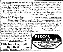 Melvin Widman, 11 year old son of Walter Widman, Riverside, is at St. Joseph’s Hospital, Marshfield, suffering from a fracture of his skull and two ribs, sustained when he fell from the loft of a barn through an opening to a concrete floor below. He had gone to the barn to throw down some hay.