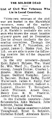 Thirty-two veterans of the civil war are buried in the Marshfield cemetery, some of the earlier graves being unmarked. Comrade P. M. Harkin is probably the only man who knows the exact location of every grave, and on Decoration Day he always conducts the decorating committee. Through the courtesy of T. F. Vannedom, adjurant, James G. Blaine, Post no. 110, we are able to give the following complete list of the departed soldiers: