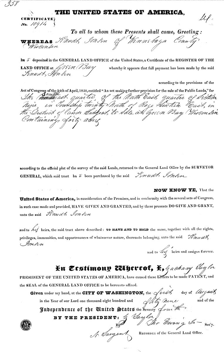 The Johnson farm in Larsen, Wisconsin would be up to 500 acres of land at one point. Five more children were born to Knute and Gyri after the move north. Knute passed away on 21 October 1871 and Gyri moved to live with her youngest son Knute II until her death on 5 September 1896. Both Knute and Gyri are buried at Grace Norwegian Lutheran Church in Larsen, Wisconsin.