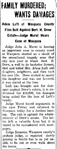 Judge John A. Murat is hearing an important case in county court at Waupaca started as the result of a sensational tragedy near that city last year in which Bert H. Drew, a well to do bachelor farmer, shot and killed Mrs. Adam Luft and daughter, neighbors, and then took his own life. Drew wished to marry the daughter and was not favored it was stated at the time.