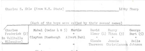 When I inherited the family history from Gertrude, the only information that was given regarding Harriet was her name as “Libby Sharp” and a few photographs of her with the family. I knew the name of my husband’s great grandfather CF Ehle, and the names of his 5 brothers and sisters: Henry Elton, George Burton, Myrtle Eliza and Mabel Helen (twins), and Elmer David.
