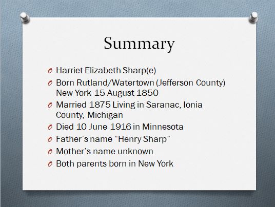 I was unable to locate any other birth records for Harriet’s children online. The new information of her birth place as Watertown, New York and the alternate spelling of her surname should be included in any further searches for her parents.