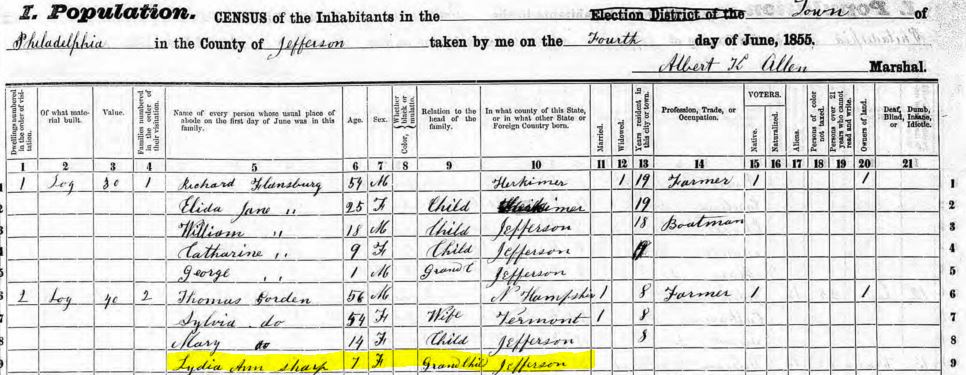 1855– Lydia Ann #1 living with grandfather Thomas Gordon in Philadelphia, NY