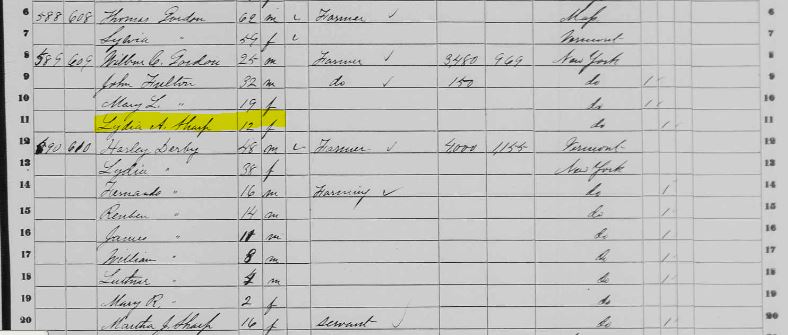 1860– Lydia Ann #1 living with Wilbur Gordon next to grandparents in Wilna, NY