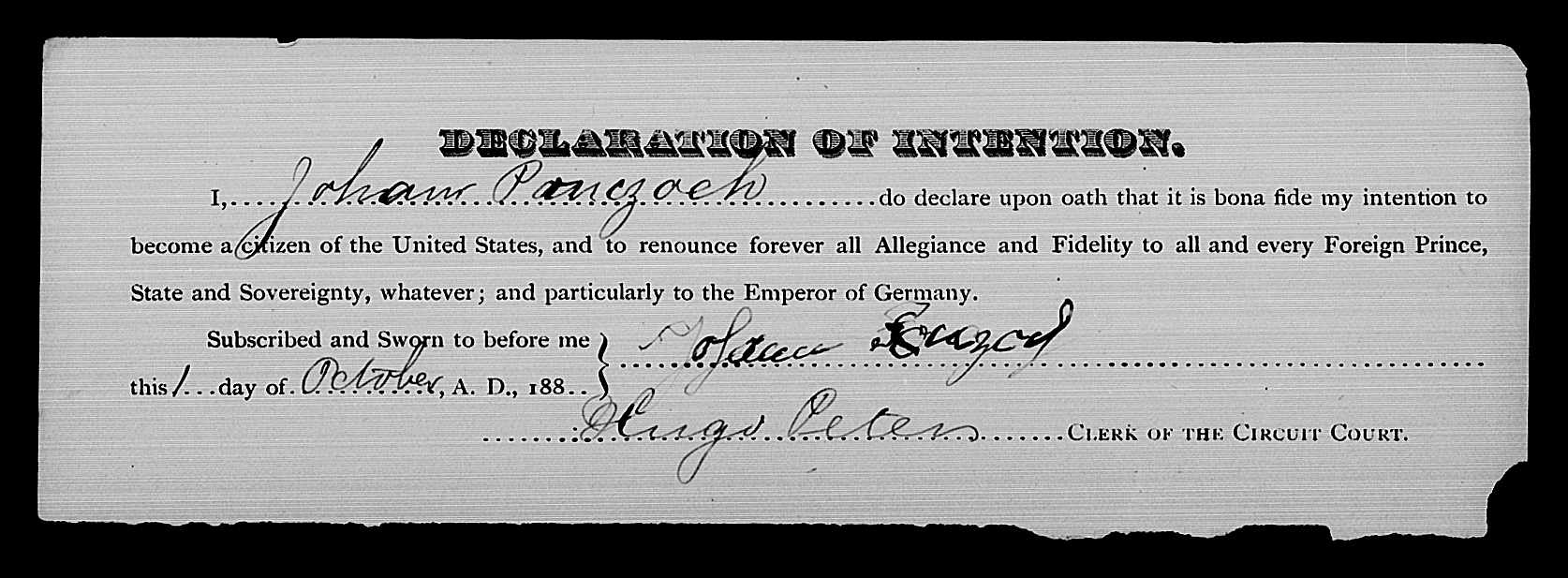 My great grandmother was Mary Ponczoch. She grew up in the Rozellville/Stratford area of Marathon county, Wisconsin. Her parents, John (Johann) and Ottilie, came to the US in 1880 with a daughter, Anna, listed on the ship’s manifest. The family appears to have come directly to Marathon county. On 15 October 1883, Mr “Panshock” filed his first papers for Naturalization in Marathon county. In June of 1885, the family is enumerated on the Wisconsin State Census in the Town of Day (near Rozellville). The family consists of 5 members, 3 males and 2 females. The census further indicates that 3 persons were born in Germany, and 2 in the US. The 3 born in Germany can only be John, Ottilie, and daughter Anna (all listed on the ship’s manifest at immigration), so there are 2 boys that have been added to the family since 1880 when they arrived.