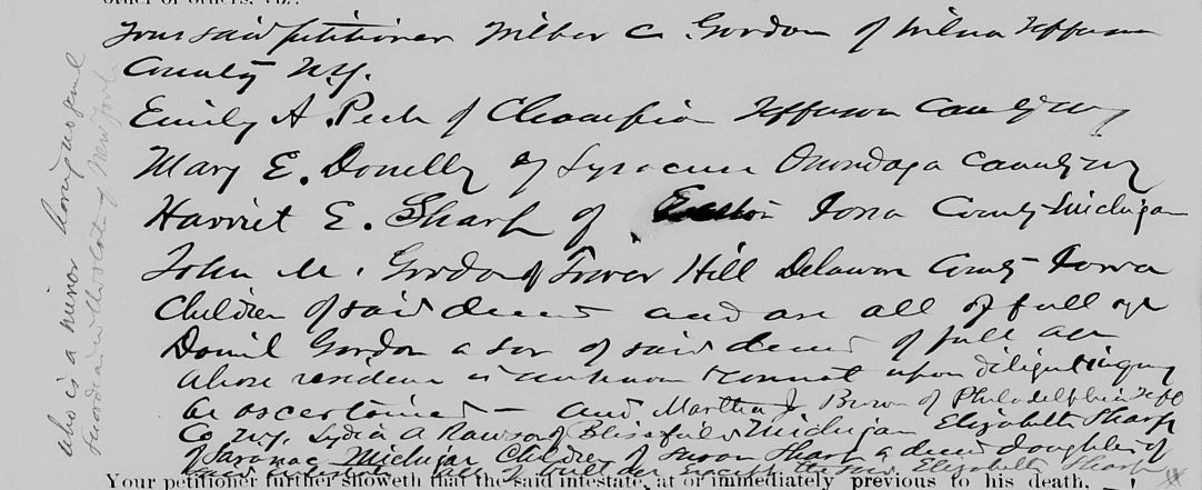 The petition also lists the remaining family members who have interest in the estate. The list includes Wilbur and the names and residences of all of the children of Thomas and Sylvia Gordon. Listed are the following: