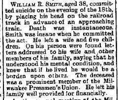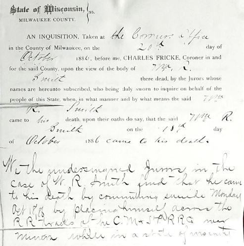 The story of his death as told to us by my husband’s grandmother (granddaughter of William and Lila) was that he was deaf and was walking along a railroad track and was killed by a train in Milwaukee. When I started looking for him in the newspapers, I was surprised and alarmed to find that in fact he had apparently committed suicide by laying on a railroad track. The report was in The Wisconsin Weekly newspaper in Milwaukee. I was unable to locate an obituary for him, however, any death that is not a natural death has to have a coroner’s inquest report. I contacted the Milwaukee Historical Society and received a copy of the whole report.