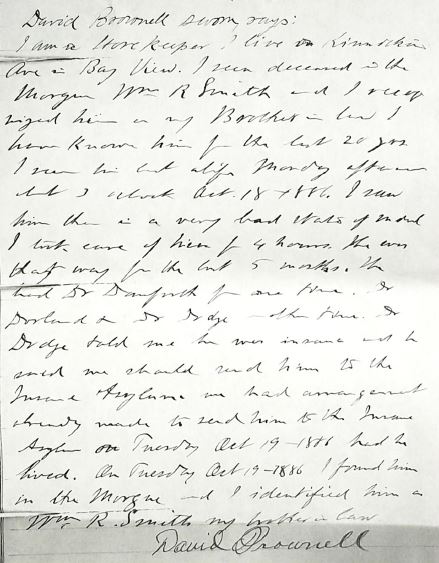 “I am a storekeeper. I live on Kinnikinnic Ave in Bay View. I seen deceased in the morgue Wm R. Smith and I recognized him as my brother in law. I have known him for the last 20 yrs. I seen him last alive Monday afternoon about 3 o’clock Oct. 18 1886. I saw him then in a very bad state of mind. I took care of him for 4 hours. He was that way for the last 5 months. We had Dr. Danforth in one time. Dr. Dorland and Dr. Dodge another time. Dr. Dodge told me he was insane and he said we should send him to the Insane Asylum. We had arrangement already made to send him to the Insane Asylum on Tuesday Oct 19 1886 had he lived. On Tuesday Oct 19 1886 I found him in the morgue and identified him as Wm R. Smith my brother in law.” -David Brownell