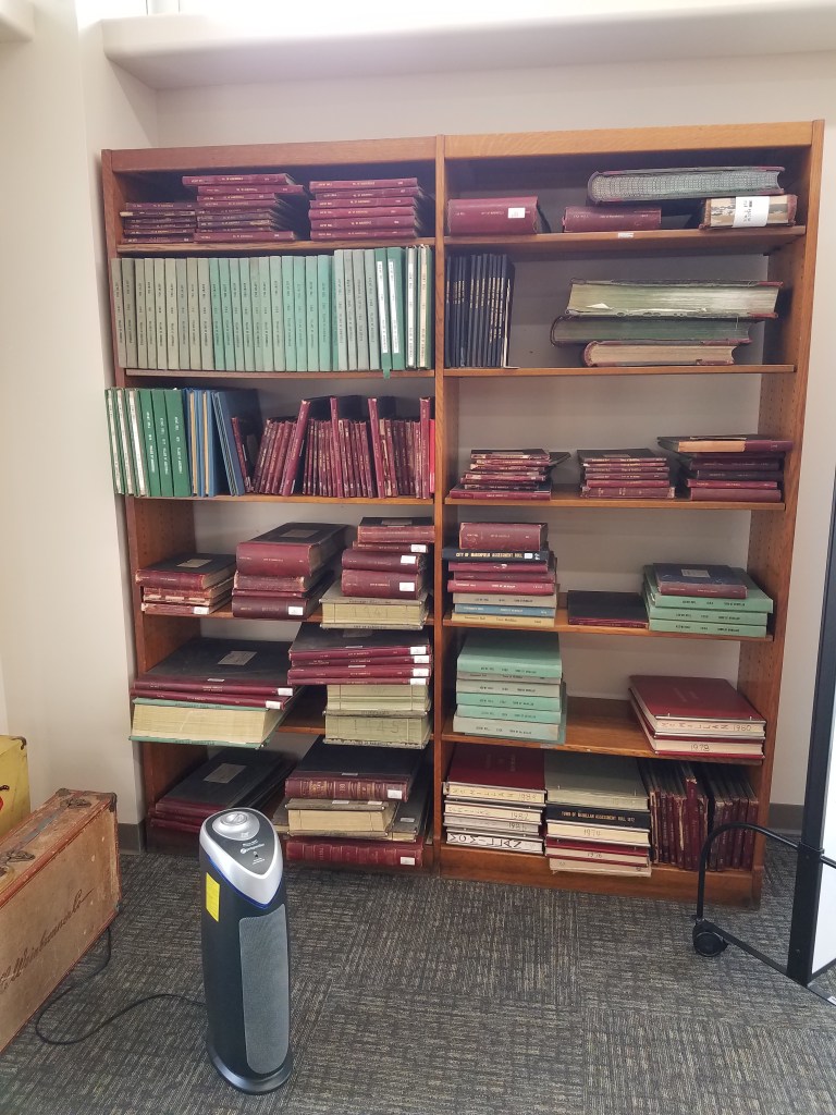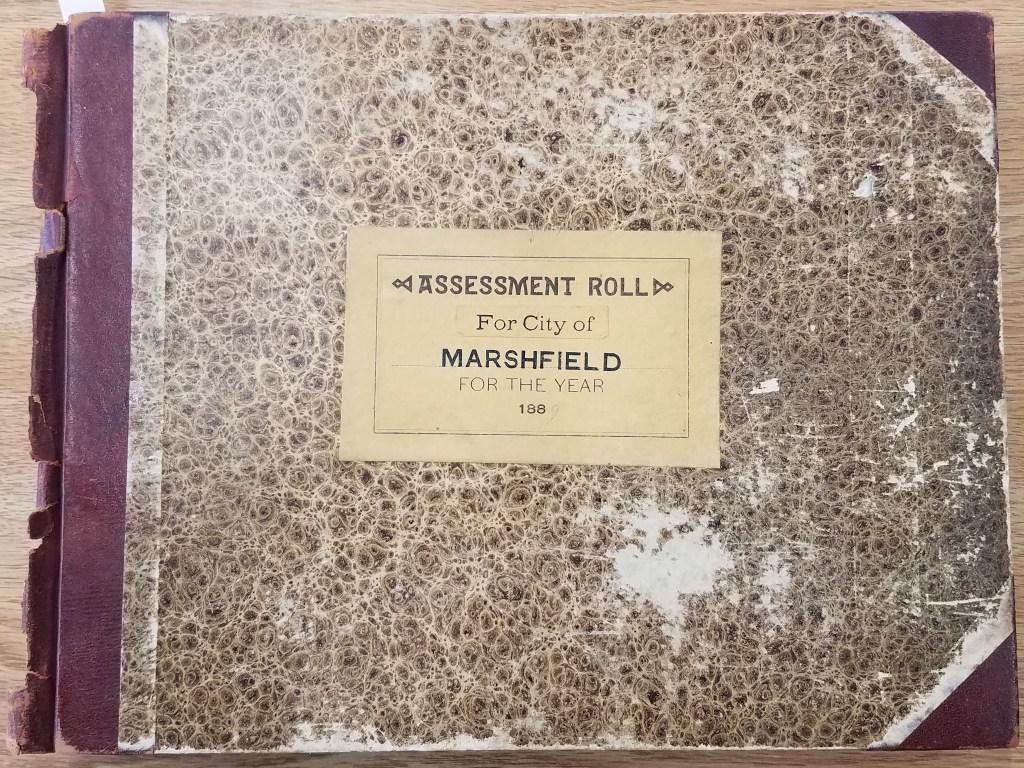 One such collection is the Tax Roll books for the city of Marshfield and some of the nearby townships. The original books are stored on a shelf and can be leafed through at one of the tables in the room. The earliest book I saw for the city of Marshfield was for 1889. The next was 1895. Not all volumes have survived, but the collection is very good.