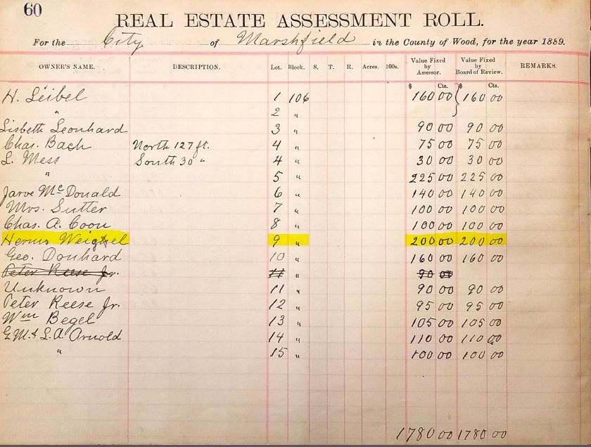 In the second half of the Tax Roll books, there are listings for personal property. I found that Herman Weigel was not listed in the personal property section in the city of Marshfield books in any of the years that he lived in the city. Property listed for citizens usually included horses, cattle, wagons, etc. Also included in the property lists are watches, pianos and melodic organs, and bank stock.