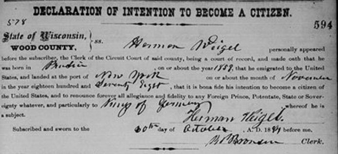 On November 6, 1878, a Joseph Weigel arrived at the port of New York. He was 26 and single. I checked the Hamburg passenger lists and Joseph Weigel left Germany on 23 October 1878 for New York. He was listed as 26, single, and a “Böttcher” or cooper from Weigelsdorf. This was very interesting because Herman’s brother Joseph Weigel who was 26, single, and a cooper from Weigelsdorf had already immigrated to the US in May of that same year.