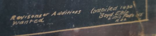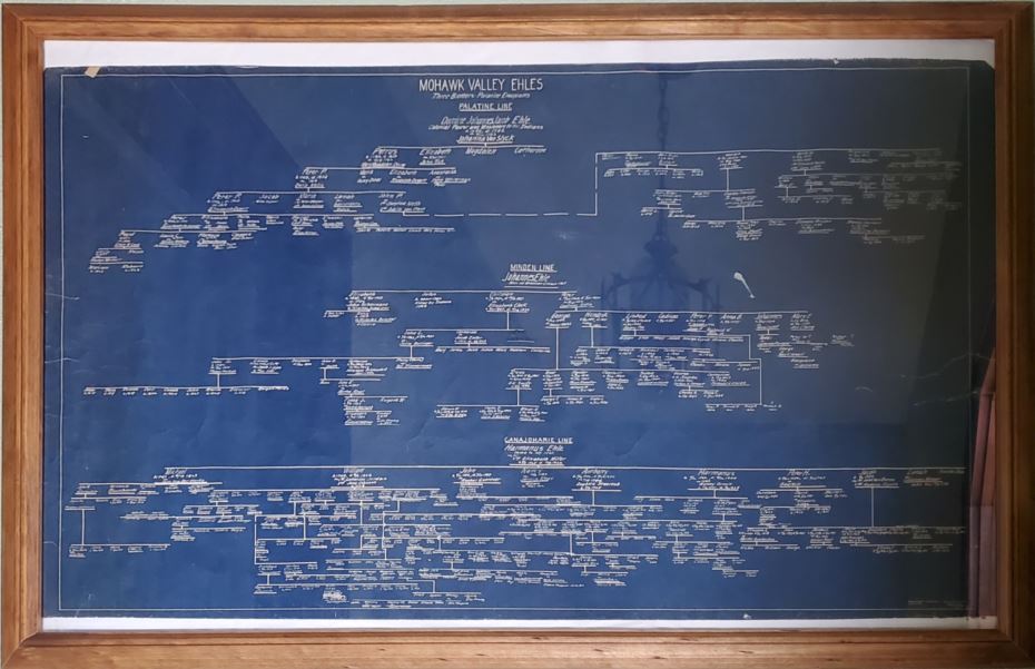 The poster sized family tree that we have was related to the publication of Boyd Ehle’s book. It seems to have been done on a sort of architectural draft paper. A little note in the bottom corner states it was compiled in 1930 by Boyd Ehle. It was in the possession of Charles Frederic Ehle, who passed it down to his daughter Gertrude. Charles would have been a contemporary of Boyd Ehle and it is possible he requested a copy directly from Boyd Ehle.