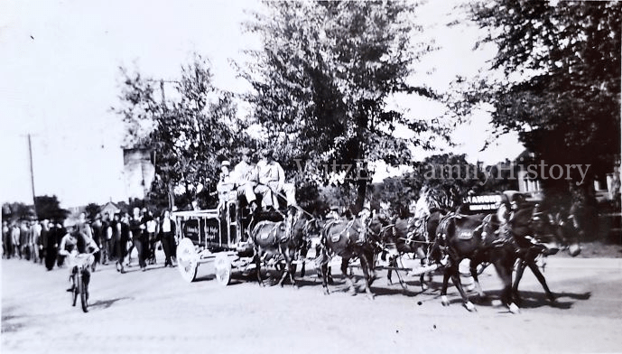 Parade downtown Marshfield ca 1945 JN Weigel is seated on the right