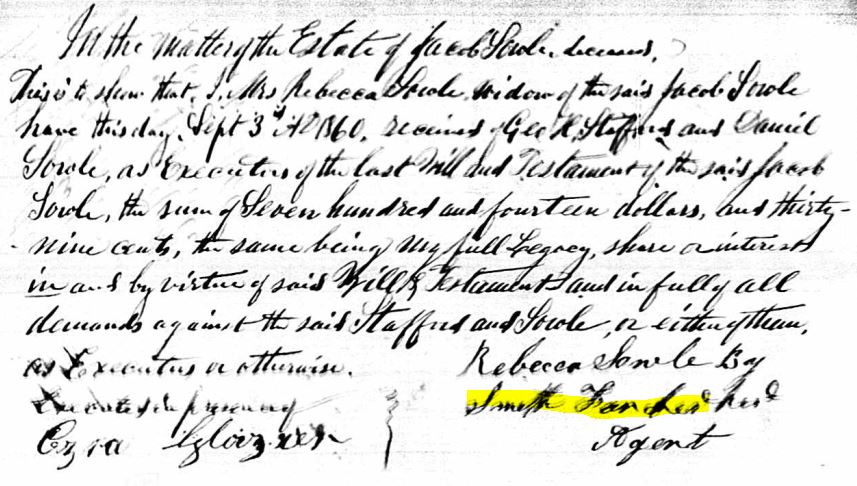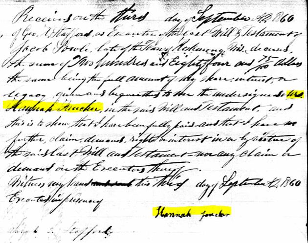 Jacob “Sowles” died 28 April 1859. Jacob’s will was submitted to the court in August of 1859. In his will he names his wife and children, Hannah being third after her mother and sister Sarah. Hannah is not listed with her married name, however, and no reference to her spouse. However, further into the probate file in the account papers, there is a receipt from “Mrs. Hannah Fancher” for her portion of the estate dated 3 September 1860. There is also another page in the account papers where Jacob Sowle’s wife Rebecca has her receipt for her part of the estate. This receipt is signed by Smith Fancher as “her agent”. Smith Fancher is the husband of Hannah Sowle Fancher.