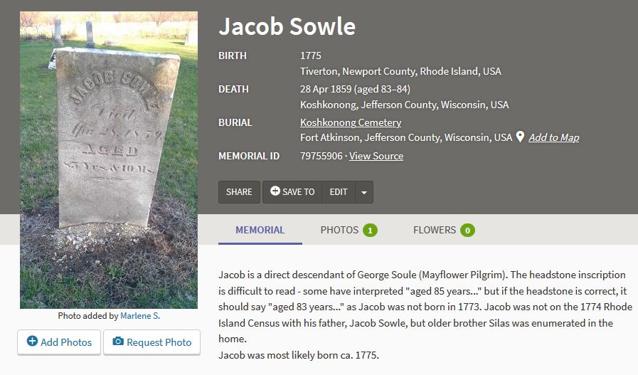 I only intended to become a manager for my and my husband’s ancestors, but sometimes managers are so happy to have someone interested in the family that they transfer more than just the memorials you request! I manage the memorials for 2 or 3 “cousins” now because of some generous managers. Occasionally a second spouse gets passed along to me even though I’m not genetically related. Another two of the memorials that I adopted were managed by Find A Grave itself. The site takes over management if there is no one to claim the memorial. Jacob Sowle is in my husband’s Mayflower line and Ralph McElhaney was accidentally killed by my grandfather. I found it quite sad that these two people were so forgotten that no one was managing their memorials.