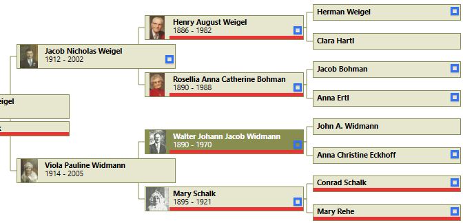 As I began to update and add to some of my new memorials, I quickly realized where I had holes in my research. I had some family members where I didn’t have complete death information recorded. Some were missing children and spouses. Going through each generation in an organized way has helped me (forced me?) to focus my research. To know at a glance whose memorials I manage, I color coded the ancestors in my desk top software. Every one I manage has a red strip under their name on my tree.
