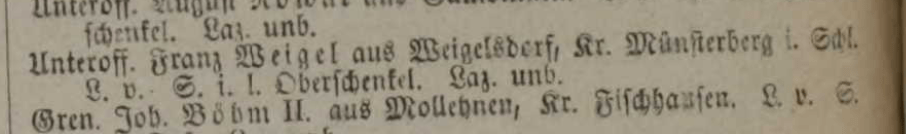 Franz Jr is listed as having died in the “Civil War in Germany”. Research into Prussian Army records reveals that Franz did die in the Battle of Noisseville on 31 August or 1 September 1870 during the Franco-Prussian War. At the time of his death, he was a soldier in the East Prussian Grenadier Regiment No.3, 5th Company from Weigelsdorf in Kries Munsterberg.