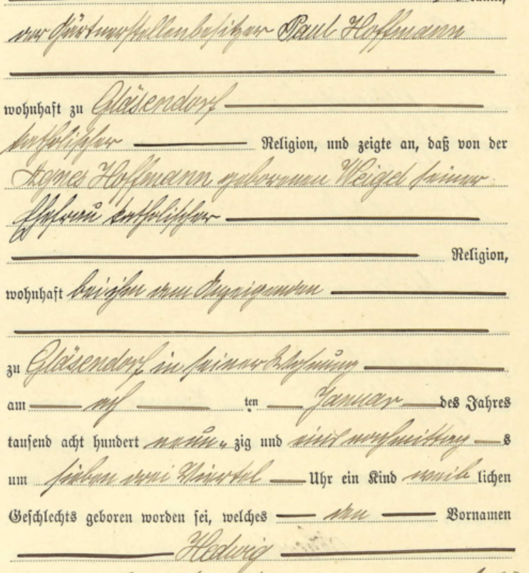 I have been unable to find any information on Theresa, but Agnes had married a “Hoffman” by the time of her mother’s death in 1904. A search of East Prussian records reveals Agnes Hoffman nee Weigel having 2 children with husband Paul Hoffman in the village of Glasendorf in 1888 and 1891. This village is very close to Weigelsdorf, Kries Munsterberg.