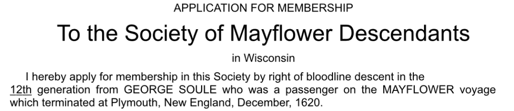 I sent our original application about 18 months ago to the Wisconsin Chapter of the Mayflower Society. I heard nothing even after sending a second email asking for confirmation that they had received the application. I was thinking the “line” must be pretty long for applications to be reviewed and just set the project aside and worked on collecting the information that I thought I would need when the society eventually contacted me. Recently though, I found that the Wisconsin Chapter has a Facebook page so I sent a message to see if they could offer me insight on the process.