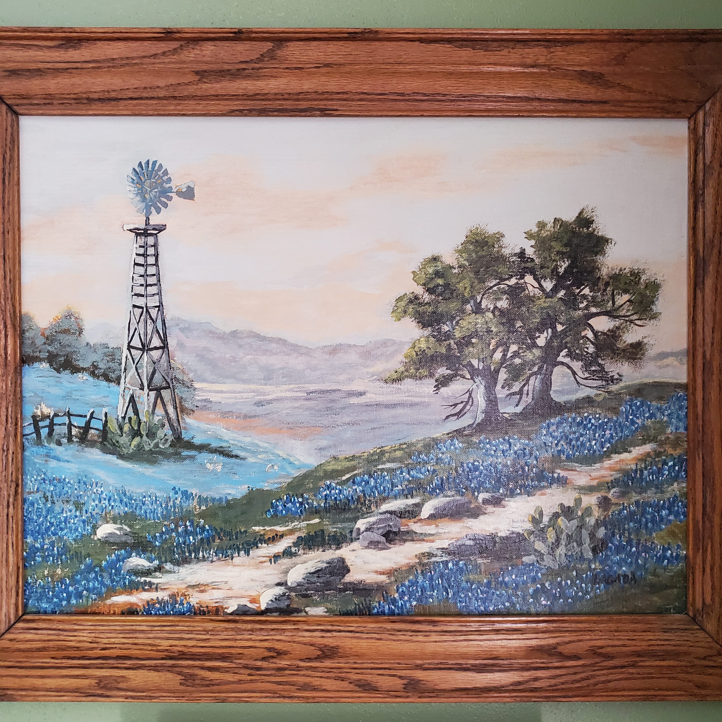 Oma Babe took a painting class with artist Arnold Vail at some point probably in the 1980s. I know that at least one of the paintings I have was done during that class. She painted a scene from the Texas countryside with bluebonnets and cacti when she made a trip there to visit Harold and Berta Mae Widmann.