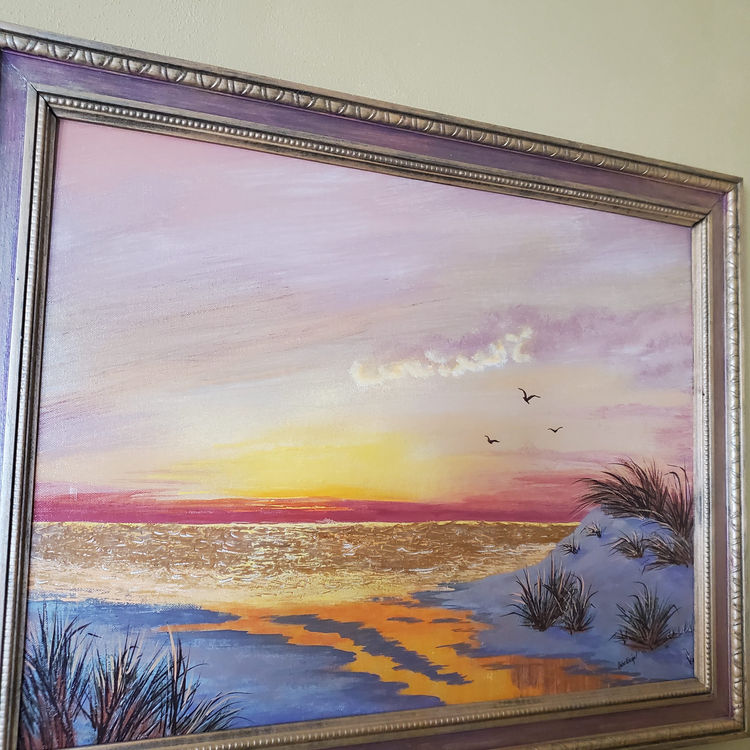 Another painting is a scene of a beach at sunset with sand dunes and gulls. This could be either the ocean or possibly the Great Lakes. This is the painting from the Vail class.