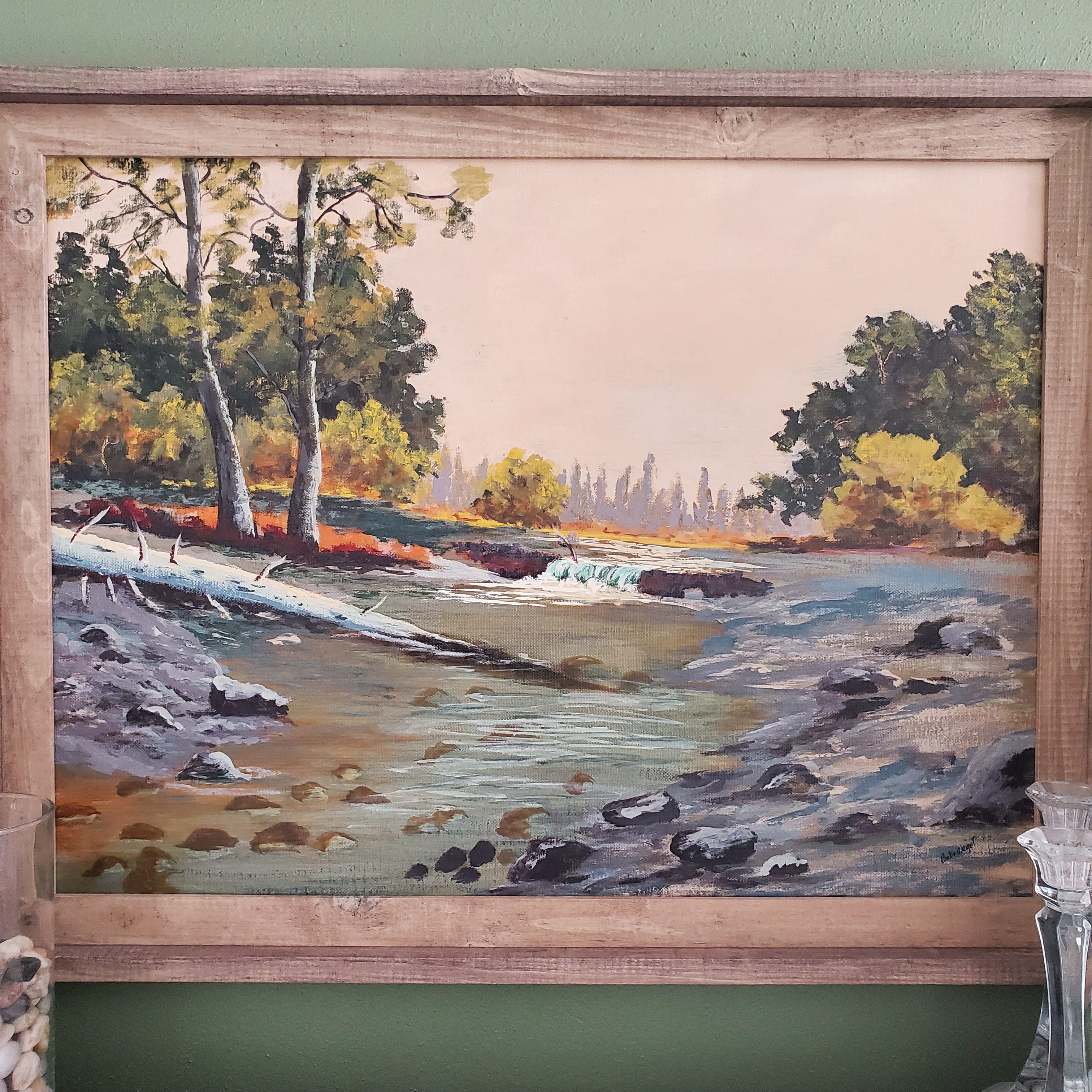 The third painting is a river with a small rapids running through a forest with birch trees. This one looks to me like a Wisconsin scene.