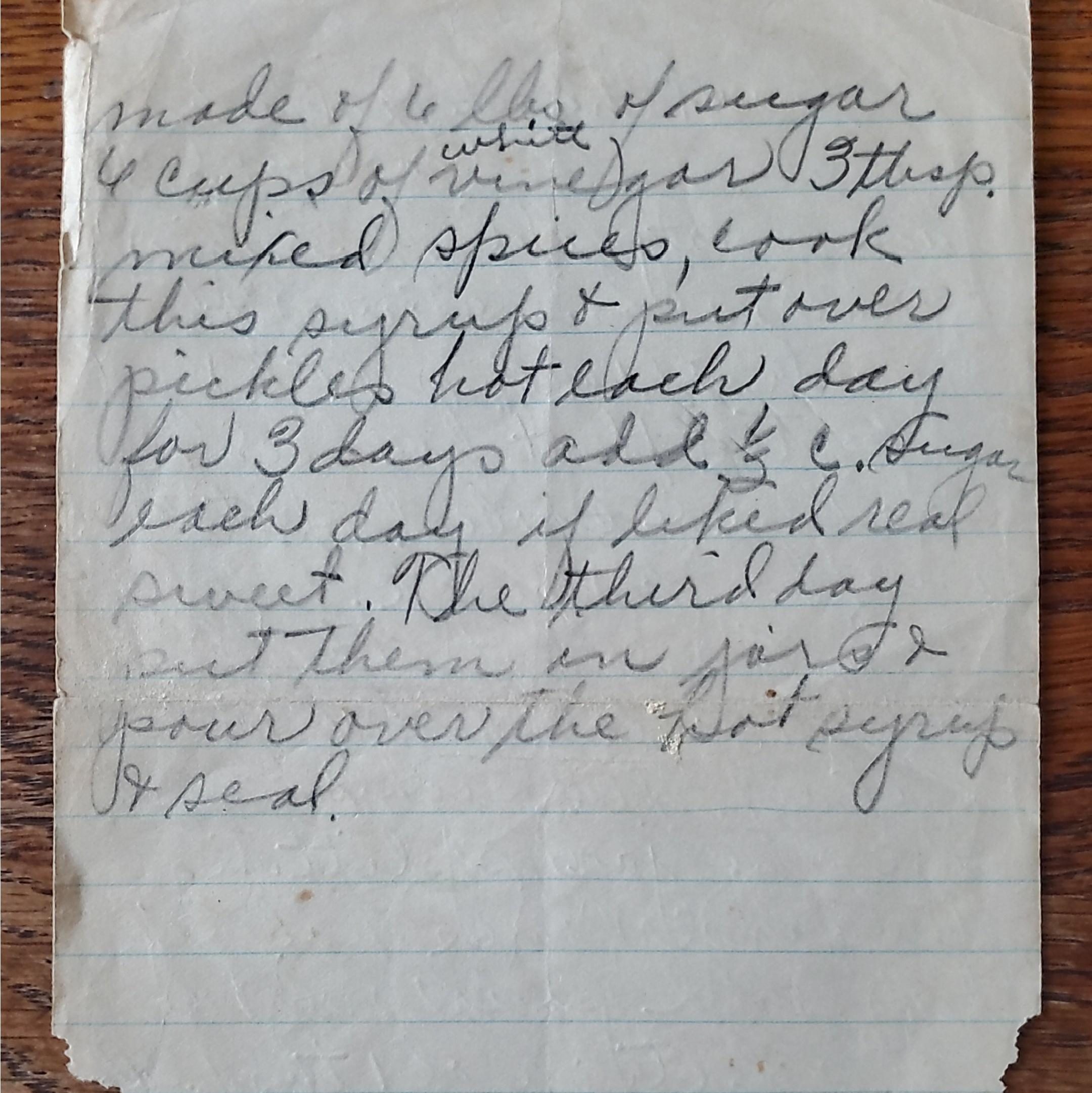 {syrup} made of 6 pounds of sugar, 6 cups of white vinegar, 3 tbsp mixed spices, cook this syrup and put over pickles hot each day for 3 days. Add ½ cup sugar each day if liked real sweet. The third day put them in jars and pour over the hot syrup and seal.