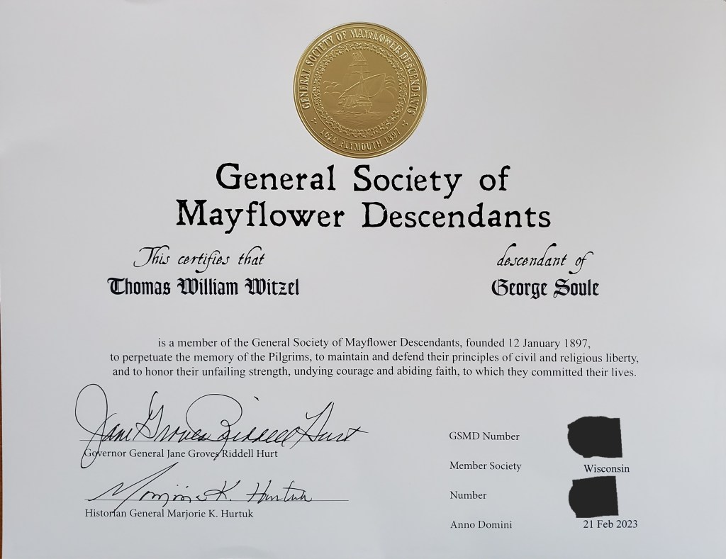 I am happy to report that our application for membership to the General Society of Mayflower Descendants was accepted and my husband is now a member of the GSMD! We attended our first members meeting and my husband received his certificate last Fall.